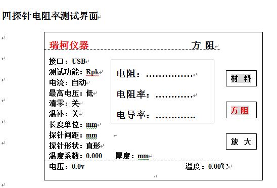 2.設定好薄膜的厚度,探針間距、電壓根據需要選擇高,中,低檔位;選擇探頭形狀;方形還是直線形探針.
