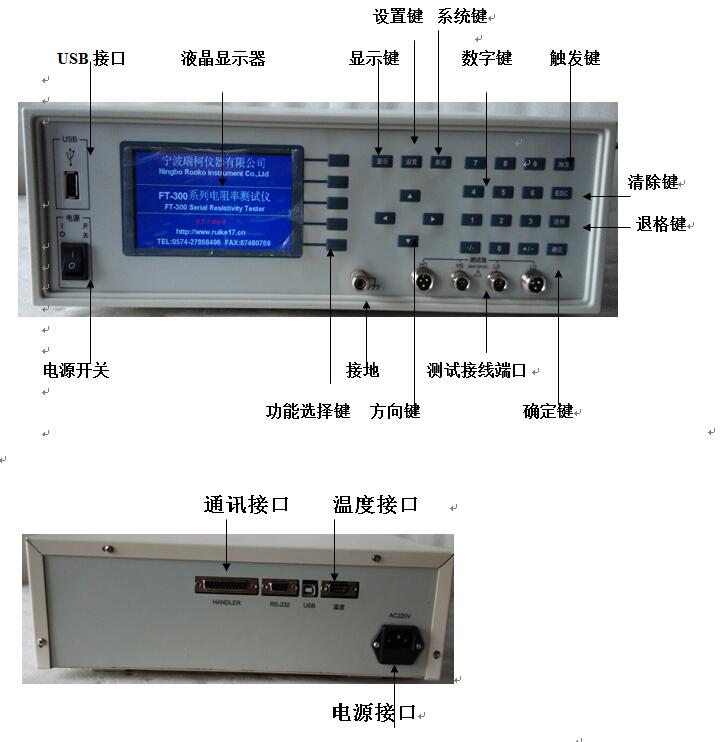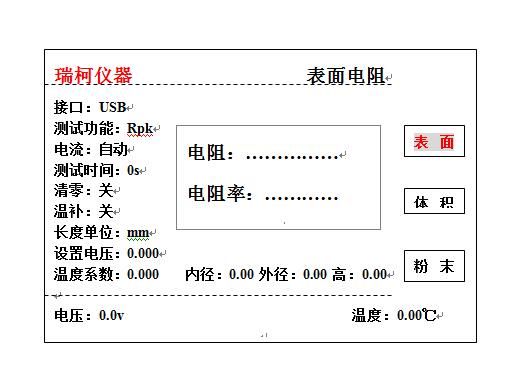 2、液晶顯示: 電阻率、壓強、溫度、電導(dǎo)率、電流電壓、可輸入測試樣品數(shù)據(jù)(圓柱:直徑,高度;方體:長*寬*高)單位可以切換(mm、cm、m)